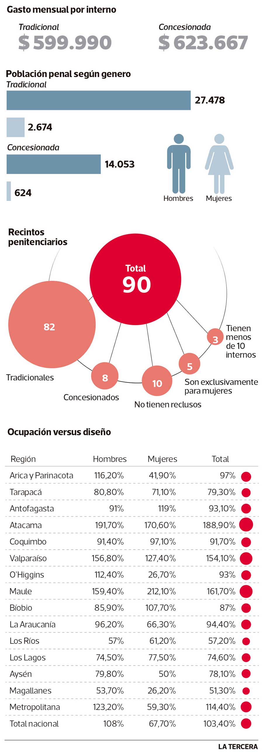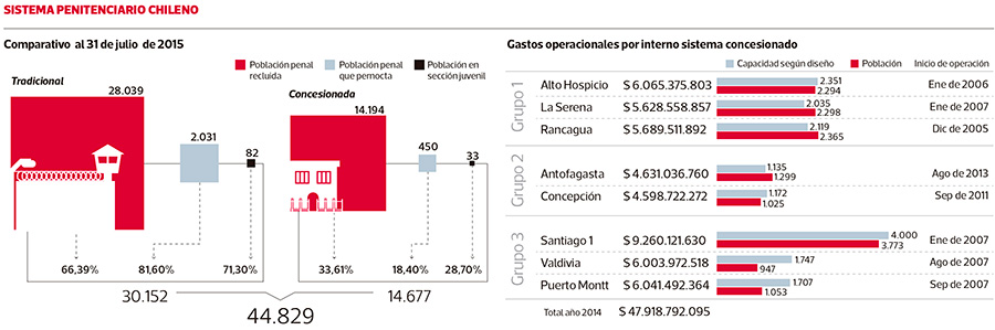 Tras la redistribución, los penales concesionados han controlado la capacidad, excepto Antofagasta que tiene un 13% de sobrepoblación y se está proyectando ampliar su capacidad un 20%. En conjunto los tres grupos de cárceles albergando al 33% del total de población penal de Chile, y reciben del Estado un promedio de $ 623 mil al mes para mantener a un interno. El problema del hacinamiento se mantiene en las zonas donde no se han realizado inversiones, como Atacama, Valparaíso y Maule.